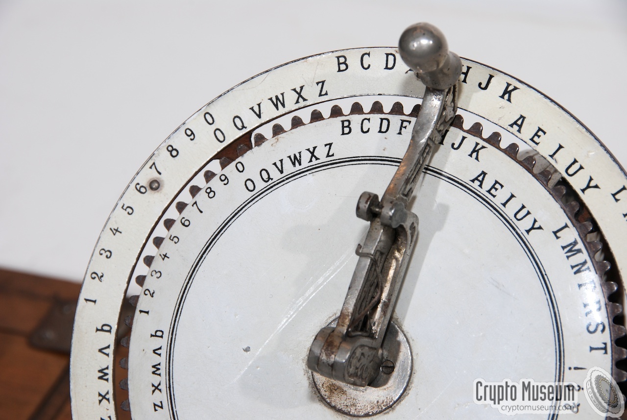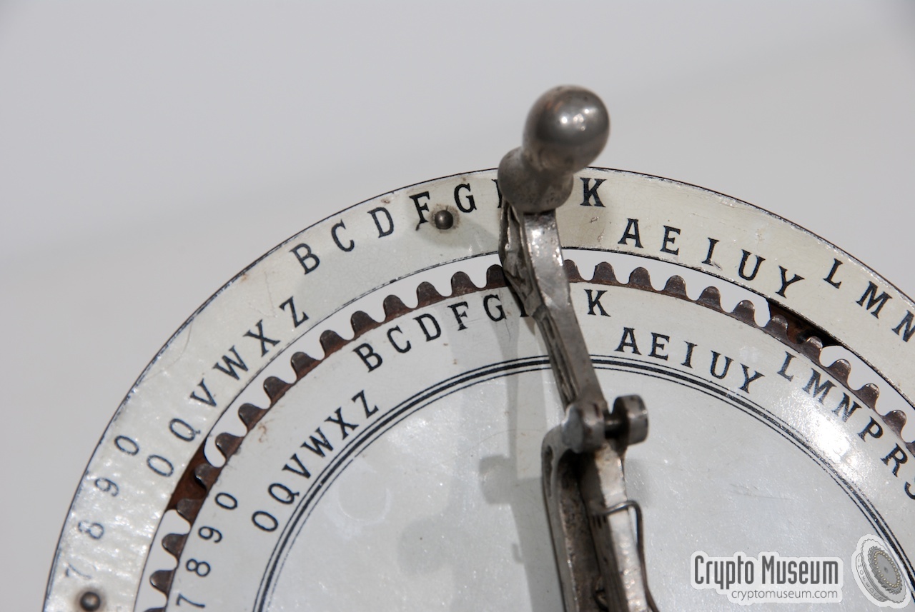 The device consists of two concentrical discs, each with the full alphabet