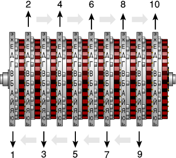 10 cipher wheels). It consists of two sets of transport-combs: the upper