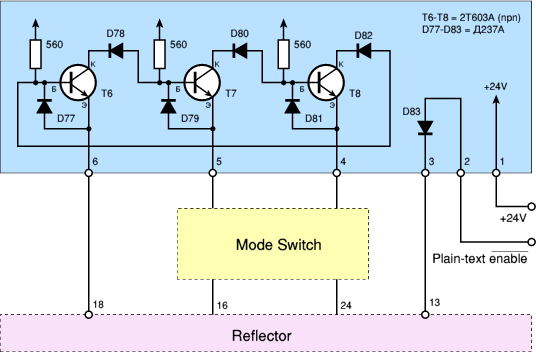 Pins 16 and 24 of the reflector are routed via unit 8 and 9 of the MODE switch.