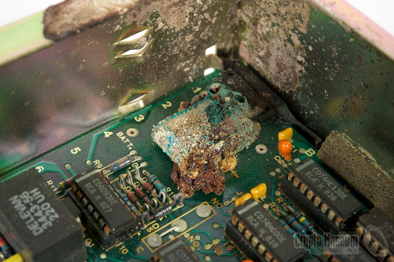 the liquids from the battery can 'eat' away copper tracks from the PCB