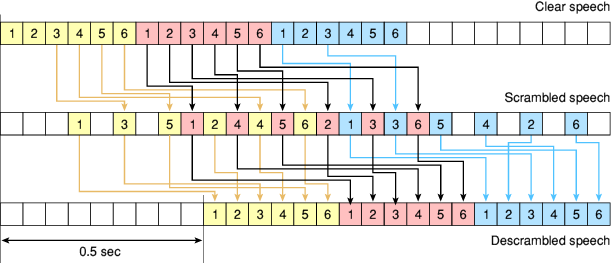 Finally, the bottom row shows the speech once it is descrambled again (output).