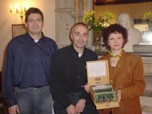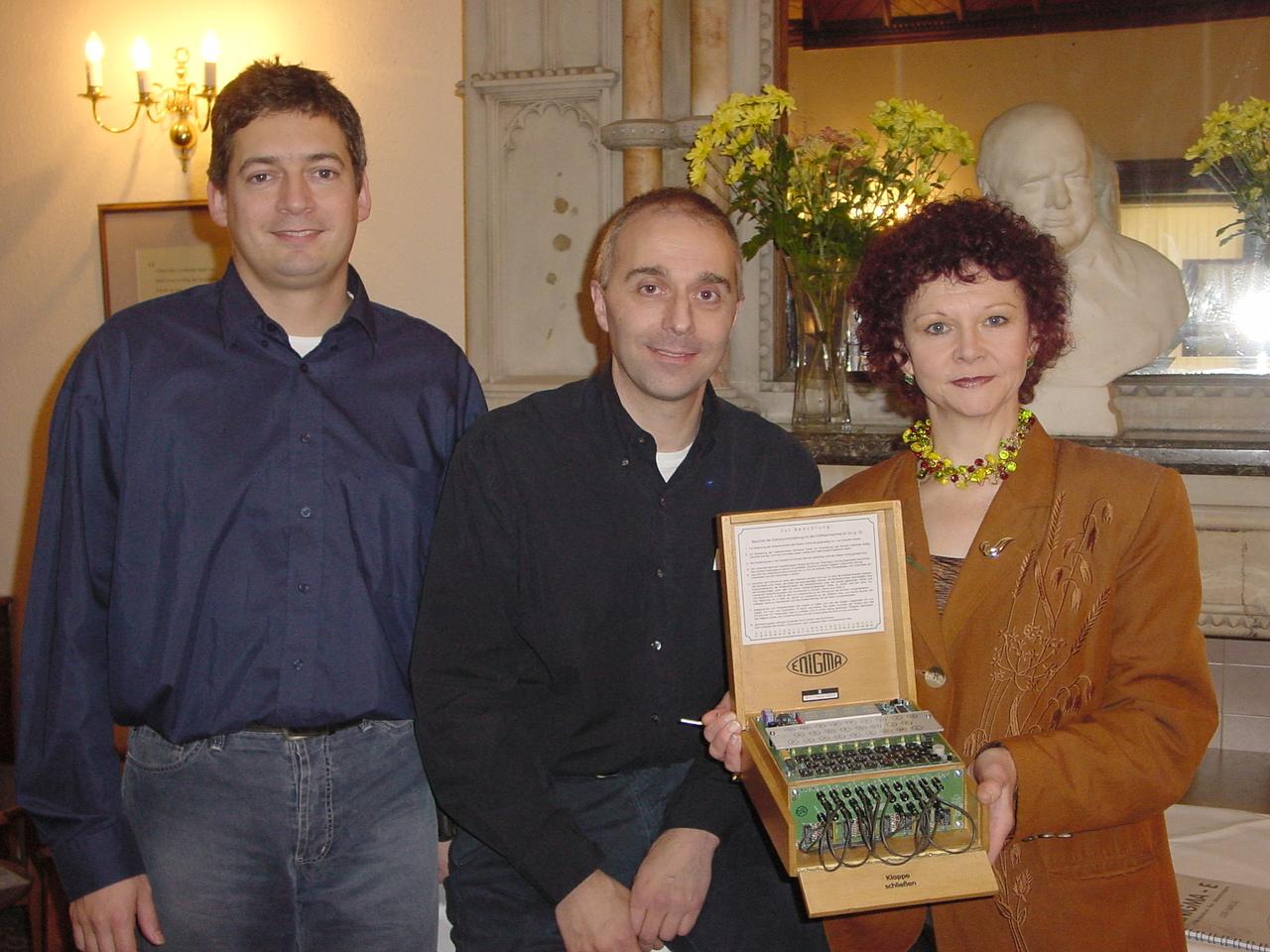 of the Enigma-E (in a wooden box) to Christine Large, managing director